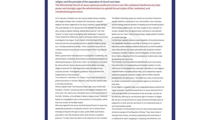 If one religion is targeted today, any marginalized group could be the target tomorrow. The Shincheonji Church of Jesus will stand firm in truth and faith within the framework of law and order, and will not be silenced, affirming its constitutional right to freedom of religion. We call upon the government to cease emotional branding, base its judgments on facts and law, and return to its fundamental duty of serving all people equally.