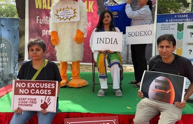 New Delhi, March 29, 2025- Bharat Initiative for Accountability (BIA), a coalition of Indian animal welfare organisations, staged a protest today at Jantar Mantar, demanding that multinational food-services giant Sodexo fulfil its global cage-free egg commitment in India. Despite pledging to source 100% cage-free eggs worldwide by 2025, Sodexo has made virtually no progress in India, with less than 1% of its eggs cage-free—while successfully transitioning in Europe and North America.