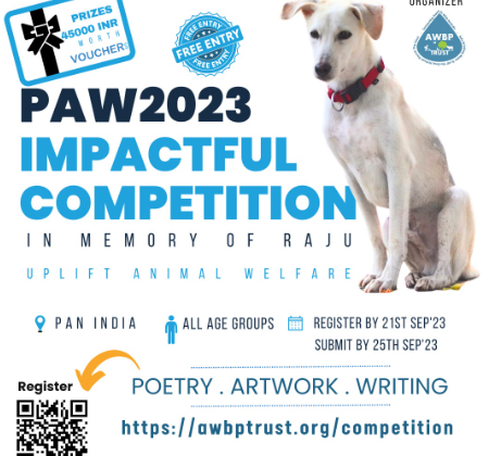 We are happy to announce the launch of the 5th PAN INDIA Competition “PAW2023”, in memory of Raju, the dog who inspired this movement. PAW is a vibrant annual initiative to connect all age groups to animal welfare by showcasing their creative skills like poetry, artwork, and writing. All age groups can participate in this competition under three categories Poetry, Artwork, and Writing.